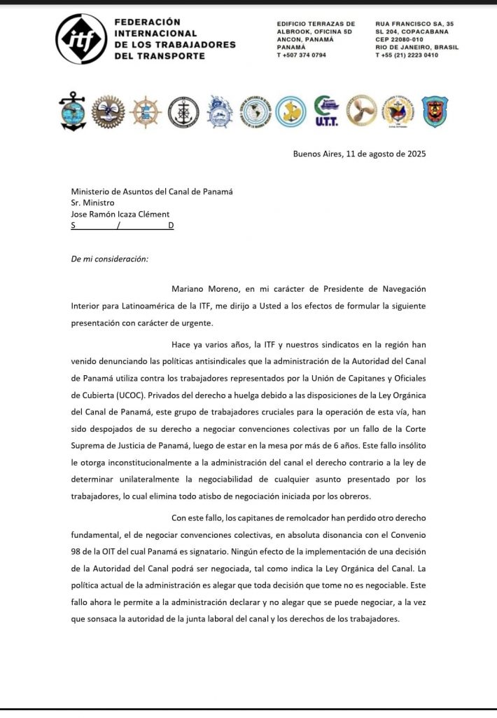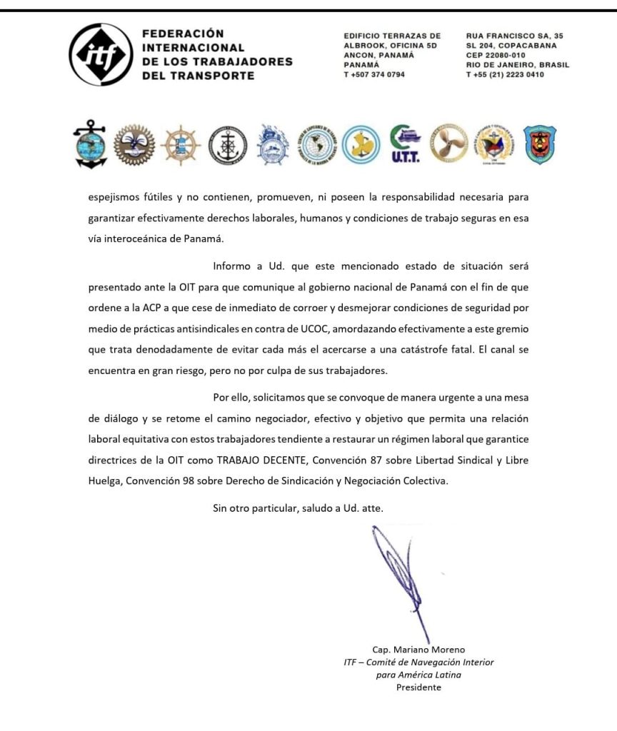 En una carta dirigida al ministro de Asuntos del Canal, José Ramón Icaza Clément, el Capitán Mariano Moreno, presidente del Comité de Navegación Interior para América Latina de la ITF, advirtió sobre el deterioro de las condiciones de seguridad, la fatiga extrema del personal y la negación sistemática de derechos sindicales dentro de la Autoridad del Canal de Panamá (ACP).
