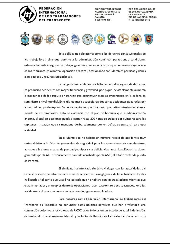 “La actual política de la administración del Canal atenta contra los derechos constitucionales de los trabajadores, perpetúa condiciones inseguras y provoca accidentes que ponen en riesgo la vida de los tripulantes y la operación misma del Canal”, señaló la ITF.