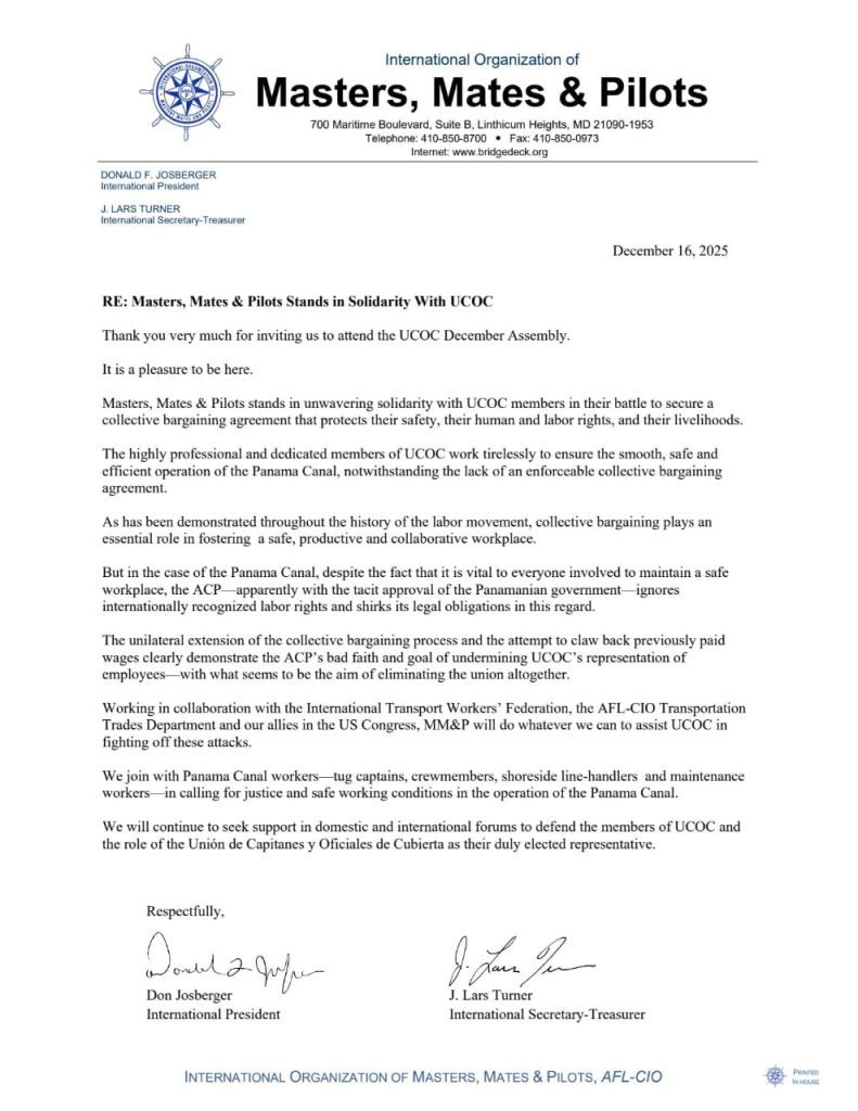 La International Organization of Masters, Mates & Pilots (MM&P), AFL-CIO, una de las principales organizaciones sindicales marítimas a nivel internacional, expresó su plena e inquebrantable solidaridad con la Unión de Capitanes y Oficiales de Cubierta (UCOC) y sus miembros, en el marco de la lucha por el respeto a la negociación colectiva y los derechos laborales en el Canal de Panamá.